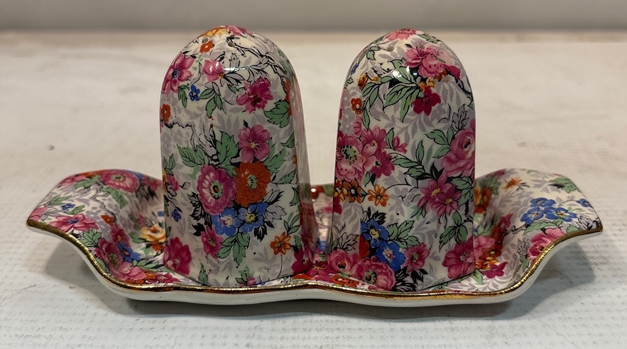On tray, 3 piece set, floral, pink, green, white, grey, Lord Nelson Ware, “Marina”, made in England